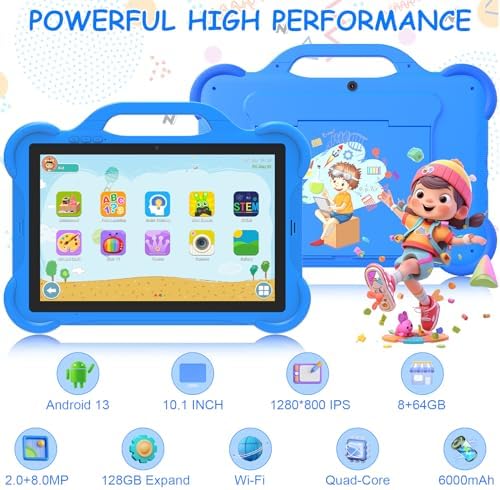 This kids tablet built-in high-performance processor. 1280×800 IPS display, Wifi, Bluetooth, 2+8MP dual camera, 6000mAh Battery ensures more than 8 hours mixed use. 8GB RAM and 64GB ROM. Support 512GB Sd Card Expand. You can storage more cartoons, movies, songs,photos. Well for watching video, listening, drawing etc.