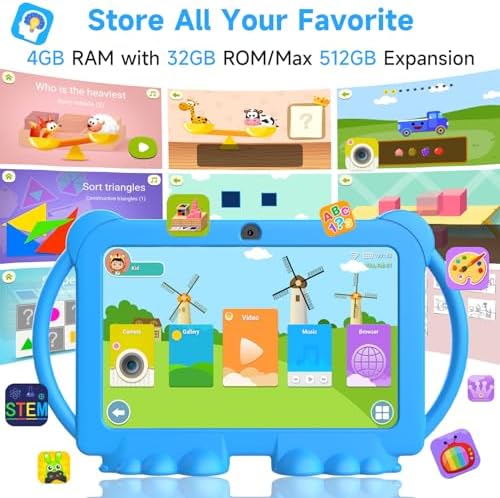 【Kids Tablet with Standable Case】The silicone case is specially designed for kids, protecting the toddler tablet from scratches and bumps, drops, etc. Side handles for easy grip, the 7 inch tablet case that can stand, so kids don’t need to hold the tablet all the time while learning, watching and playing