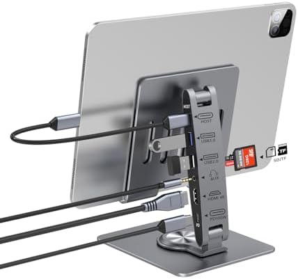 7-in 1 USB-C Hub Stand – Our iPad docking station is equipped with many different types of ports, 4K 30HZ HDMI, 3.5mm AUX, USB-A 3.0, USB-A 2.0, SD/TF Card Reader, HOST (5G), 100W PD Charging
