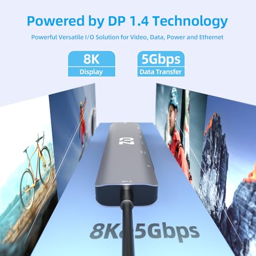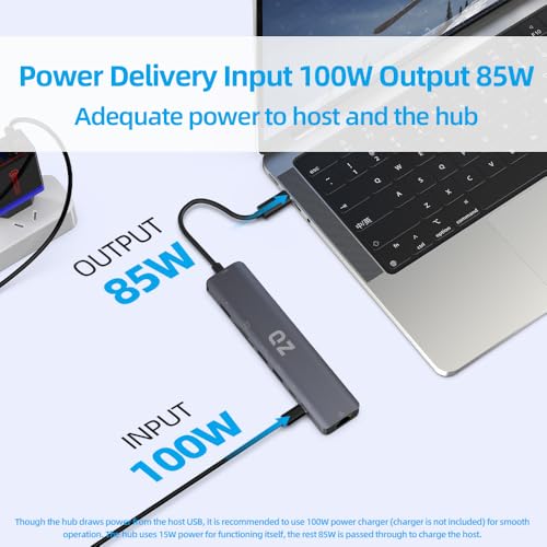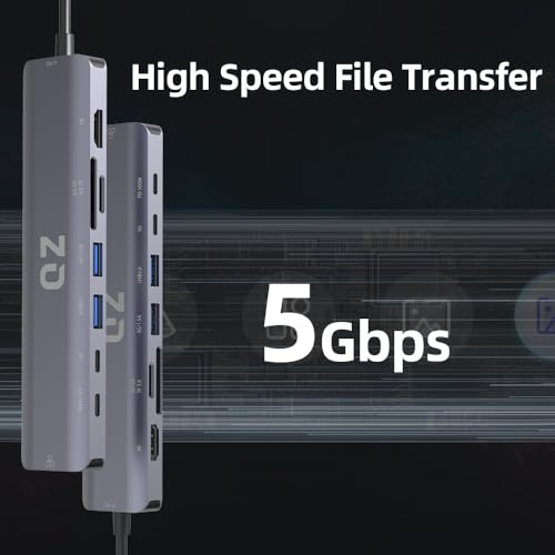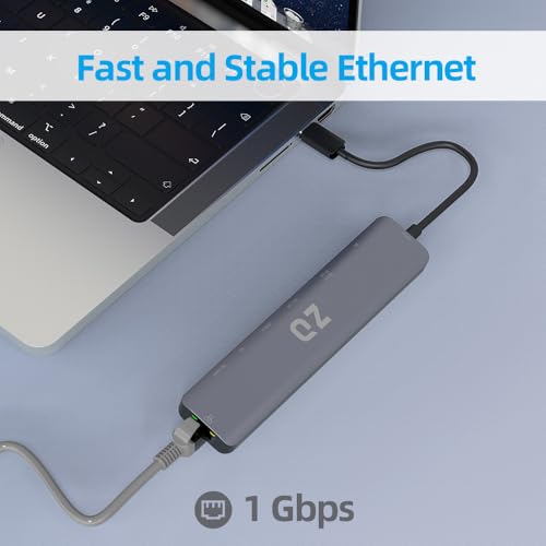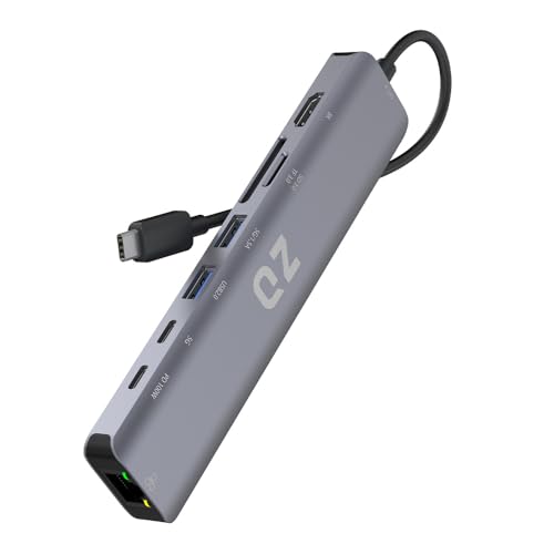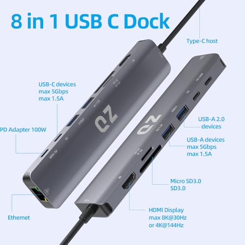 QZ USB-C Hub, 8 in 1 USB-C Dock, Power Delivery 100W, HDMI max 8K/30Hz, 4K/144Hz, USB 3.0 5Gbps, USB-C 5Gbps, SD/micro SD (TF) Card Reader, Ethernet