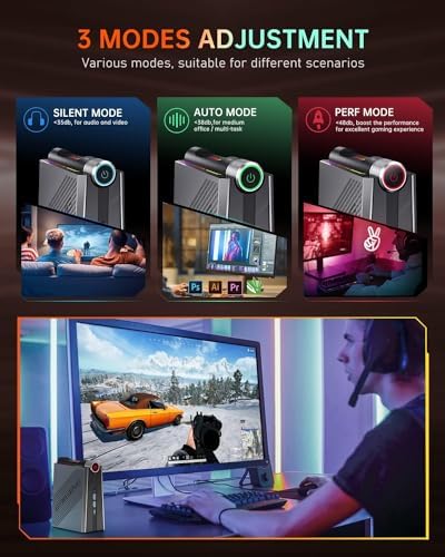 【Three Modes for Versatile Use】The AM08PRO Small Desktop PC features three different modes to suit your needs. Use the SILENT MODE for movie watching and light office work, AUTO MODE for medium office software like 3D visualization, and PERF MODE for gaming. Easily switch between modes for optimal energy saving and performance. The unique vertical design and stunning RGB lighting effects make this mini PC a stylish addition to any setup