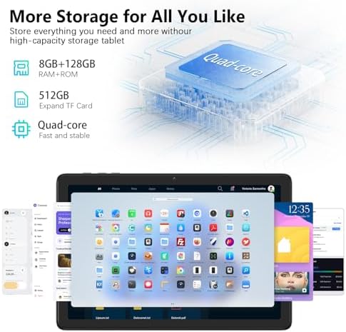 【More Storage for All You Like】Store apps, videos, images or work files effortlessly with the generous 8(4+4)&128GB storage configuration. Need more space? Support TF card expanded up to 512GB for limitless storage possibilities. (Not supprt SIM card, it’s a wifi tablet.)