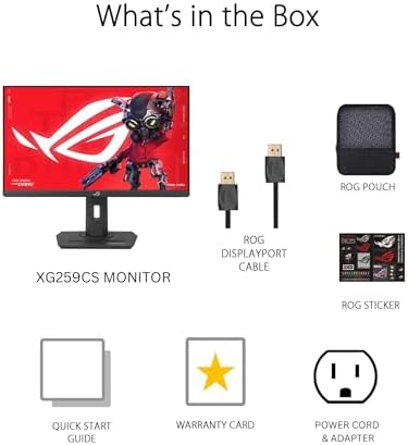 What’s in the Box: DisplayPort cable, Power cord & adapter, Quick start guide, ROG pouch, ROG sticker, Warranty Card