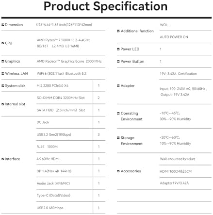 CPU AMD Ryzen 7 5800H 3.2Ghz-4.4Ghz; L3 cache 16Mb GPU 8 Core 2000Mhz RAM 16GB(8 x 2) or 32GB (16 x 2) DDR4 SO-DIMM 3200Mhz ROM 500GB/1TB M.2 NVMe SSD Interface USB 3.2 x 3; USB2.0 x 1; HDMI x 1+DP x 1; Type-C(PD Chrage) x 1; RJ45 Gigabit Ethernet 1000MBps/S x 1; Extensions Support RAM Max 64GB; Support 2.5Inch 7mm SSD2TB or 2TB HDD;