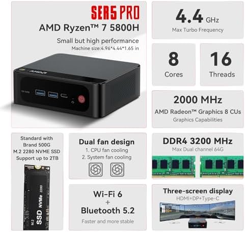 In addition, the size of the mini PC SER5 Pro 5800H is only 4.9×4.4×1.65 inches; it can be carried around and Portable Use.