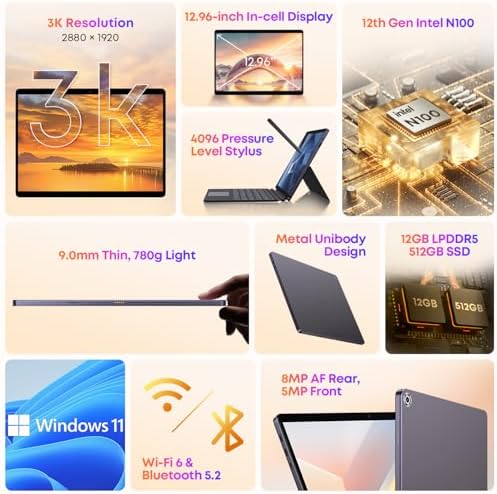 【Large Storage Capacity】Supercharge your tablet experience with a formidable 12GB of RAM, effortlessly juggling a myriad of programs. The capacious 512GB SSD is your digital haven for documents, media files, and data. This 12.96″ tablet has a 5MP front camera and an 8MP AF rear camera equipped with autofocus, every moment becomes a masterpiece.