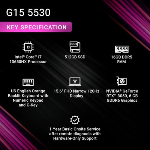 i7-13650HX | 16GB DDR5 | 512GB SSD | Win 11 + Office H&S 2021 | NVIDIA® GeForce RTX™ 3050, 6 GB GDDR6 | 15.6″ FHD Narrow 120Hz | US English Orange Backlit Keyboard with Numeric Keypad and G-Key | 1 Year Basic Onsite Service after remote diagnosis with Hardware-Only Support | Dark Shadow Gray with Black thermal shelf