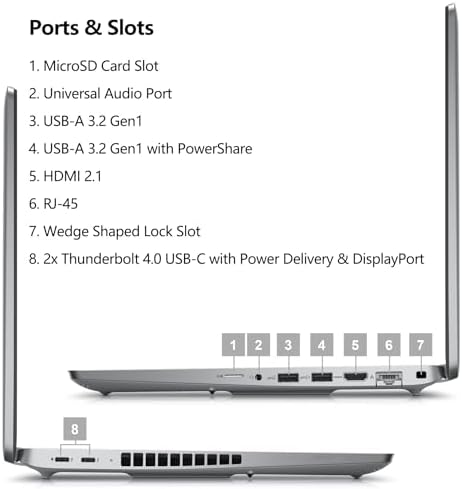 1. MicroSD Card Slot 2. Universal Audio Port 3. USB-A 3.2 Gen1 4. USB-A 3.2 Gen1 with PowerShare 5. HDMI 2.1 6. RJ-45 7. Wedge Shaped Lock Slot8. 2x Thunderbolt 4.0 USB-C with Power Delivery & DisplayPort