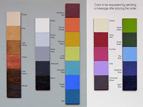 You can buy it in the cheapest finish as poplar-natural wood with no protective varnish or in many hand painted colors. The laser cut dark brown edges will never be painted.