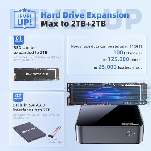 【2.5” SSD interface, Expandable UP to 2TB】DreamQuest Mini pc Built-in SATA3.0 interface, compatible with all 2.5 ” hard drives not exceeding 7mm.