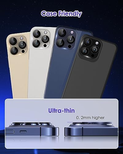[3D Metal/Glitter Design] Delicate 3D metal/glitter produces a fascinating reflective sheen in any light. 3D lens cover ring matches your fashion style. You can use differient color lens to decorate for your iPhone 16 Pro Max/ iPhone 16 Pro/iPhone 14 Pro or iPhone 14 Pro Max, which protect your camera lens while making it a personalized decoration. The 9H tempered glass & black circle design, No fog, No blue light is caused when using flash.