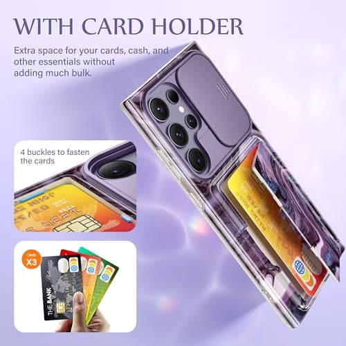 [Sliding Camera Lens Cover & Kickstand] The sturdy sliding camera cover and raised lips around the camera protect your phone camera from getting scratched and scuffed.The card holder can be used as a kickstand, freeing your hands when you’re watching a video and enhancing your multi-tasking. Please keep your cards and cash safely from falling out when you use the card holder cover as a kickstand.