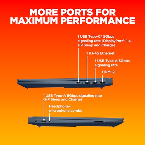 Ports: 1 USB Type-A 5Gbps signaling rate; 1 USB Type-A 5Gbps signaling rate (HP Sleep and Charge); 1 USB Type-C 5Gbps signaling rate (DisplayPort 1.4, HP Sleep and Charge); 1 HDMI 2.1; 1 RJ-45; 1 AC smart pin; 1 headphone/microphone combo