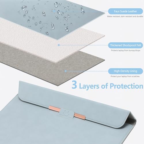 Multiple Protection: The outermost layer is made of faux suede leather, which is tear resistant, dirt resistant and water resistant. The middle layer is embedded with soft non-woven fabric that provides shock absorption for your laptop. The lining is soft, delicate and flexible, protecting your laptop from scratches when you take it out or put it in the sleeve. Hidden magnets closure and trapezoidal opening allow you to access your laptop quickly while your laptop won’t be damaged by the magnets