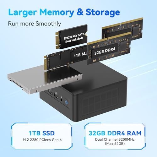 【Small Outside, Powerful Inside】–Intel NUC 13 Pro mini pc with high-speed 32GB DDR4, Built-in 1TB M.2 SSD. 32GB of RAM memory makes your entire system speedy and responsive. That way it can support tasks like memory-hogging multitab browsing and opening a huge graphic file quickly and easily. If you want even more storage, you can also add a 2.5″ SSD (not included) to expand the memory for a wonderful secure data bank.