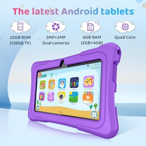 2024 Newest Model – Our kids tablet comes with 1024×600 IPS touchscreen, GMS certified Android 11 OS, Quad-core processor, 6GB (2+4) RAM, 32GB ROM (up to 128 expandable), WIFI, Bluetooth, 2MP+2MP Dual Camera, FM, GPS. Upgraded battery ensures hours of use, ideal for home or Ideal for home or outdoor travelling.