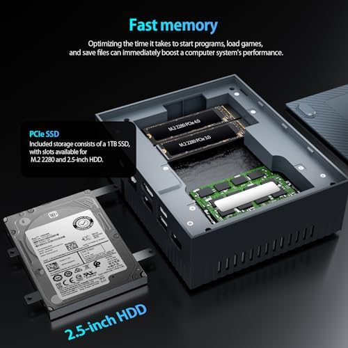 【Expandable High-Capacity Mini Computer】Comes with 32GB (16GBx2) DDR5 RAM (expandable to 64GB), 1TB PCIe SSD (supports 2x M.2 2280 PCIe SSDs, expandable to 4TB), and a 2.5-inch SSD/HDD slot (supports up to 4TB). This ample storage and memory ensure seamless multitasking and ample space for games, documents, and media. Made of durable ABS material, this lightweight mini PC is easy to carry.