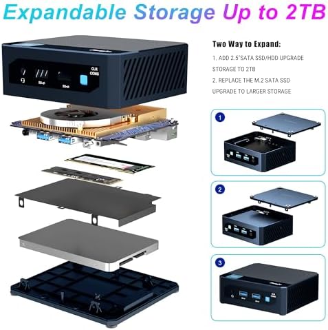 【16GB DDR4 RAM 512GB M.2 SATA SSD】Mini computers Desktop F10 preinstalled Windows 11 pro OS, equipped with 16GB DDR4 RAM 512GB M.2 SATA SSD,expand up to 2TB. The small office PC also support add a 2TB 2.5″ HDD(not included) to expand storage on bottom.