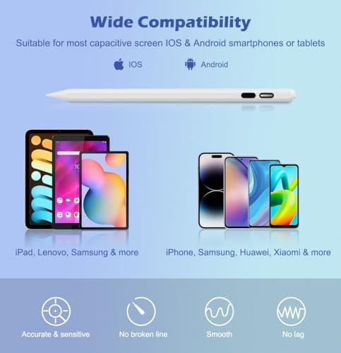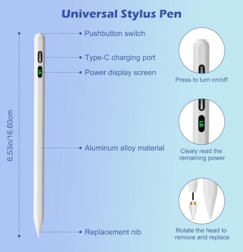 【Package Content & After-Sales Service】: This stylus pencil is made of aluminum alloy, compact and lightweight, which can meet the basic requirements of writing, painting, and playing games, suitable for various groups. What you will get: 1 × stylus pen, 4 × replacement nibs, 2 × dust plug, 1 × Type-C charging cable, 1 × user manual, 12 month sweet after-sales services. A useful gift for your family/friends around you who love to create.