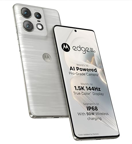 Motorola Edge 50 Pro has an amalgamation of great designs and amazing features. It embodies a silicone vegan leather finish with a metal frame for a premium feel. Its 17.22 cm (6.7) curved display is Pantone validated for true colours. This 1.5K super HD display, supports HDR10+ and has a refresh rate of 144 Hz to give clear visual effects all the time. Capture beautiful photos with this 50 MP AI-powered camera with OIS that comes with Pantone-validated colours and a f/1.4 wide aperture making it good in low-light conditions. For shake-free videos, AI video stabilization comes in handy, while the AI phone enhancement engine improves image quality. There is also 13 MP ultrawide + macro camera, 10 MP telephoto camers with 30X hybrid zoom and OIS. Selfie camera is 50 MP Auto focus. With IP68 waterproofing, 125 W TurboPower charging, and Hello UI based on Android 14 it is a versatile powerful device. The Style Sync AI generative theming allows you to customize your experience.