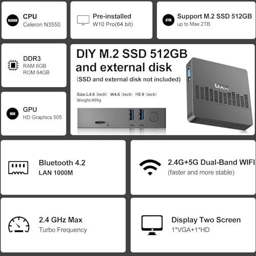 Mini pc support DIY your 2TB/512GB M.2 SSD/HDD expand storage ( M.2 SSD not included). Intel Apollo Lake mini pc with built-in HD computer graphics cards 505 is better configured to run your desktop computer’s programs faster, with clearer picture quality and more realistic images. Mini computer supports for dual screen display. According to your need, after you DIY 512GB SSD,mini pc’s capacity is larger, with expandable storage space, mini pc support for storing your favorite videos and music. HDMI and VGA ports to connect with up to two monitor. Efficient and fast to complete your tasks, you can adequately experience more entertainment, and has bulit quiet heat sink so micro fanless pc is the ideal pc for home,office and every day use.