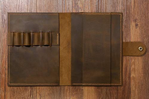 This Leather portfolio was design for A5 Size notebook like Moleskine Agenda Fieldnotes or other similar size notebook , made of high quality full grain cow leather , 100% hand cut and hand sewn … you could hold your notebook by the vertical leather strap at the right , Use it to keep you organized at work,in a meeting or at school.