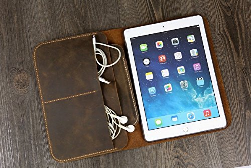 This iPad Air / iPad Air 2 case was made of oiled cow leather ,will be aged beautifully over time .simple and practical design , there are 3 pocket at the left of case (1 larger and 2 small), you could keep your stuff like notebook, headphone ,card ,charging line into these pocket .there is a TPU iPad case at the right of case , you could put and take off your iPad easily and safely .
