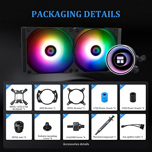 【Compatibility Extensive】Support Intel: LGA 1150/1151/1155/1156/1200/1700/2011/2066; AMD: AM4/AM5/AM2/AM2+/AM3/AM3+/FM1/FM2/FM2+, the cpu water cooler with dual platform full Metal black buckle, easy to install, can be well installed on the corresponding CPU platform, the chassis width is recommended to be greater than 250mm.