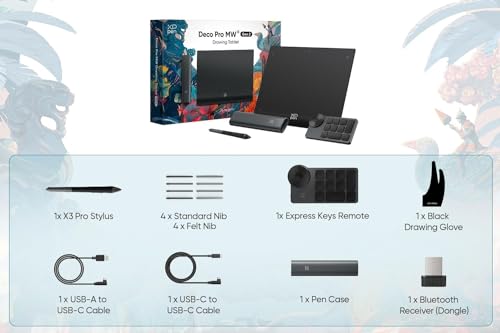 ✅ [Complete Bundle]: Standard box contents include a Pen Tablet, X3 Pro Smart Chip Stylus, Pen Case, Wireless Shortcut Remote, 4 x Standard Nib, 4 x Felt Nib, Bluetooth Receiver (Dongle)*, USB-C to USB-C Cable, USB-A to USB-C Cable, Cleaning Cloth, Drawing Glove, Quick Guide, and a Warranty Card. Free driver is also available for download