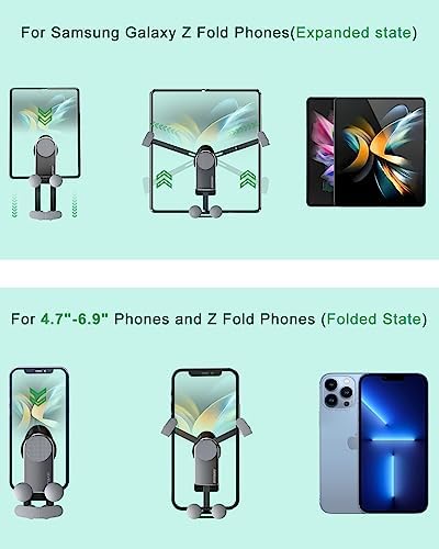 NORMAL MODE: The normal state of the z fold 4 car mount fits folded z fold 4 samsung s23 22 ultra iPhone 14 pro max and all Androids phones. The arm of the galaxy z fold 4 car phone holder is retractable, so if you have a z fold 4 and your wife has an iPhone 14, our z fold 3 car mount will quickly convert between the two sizes