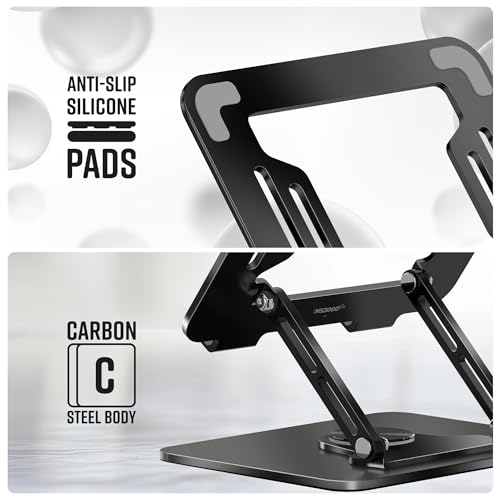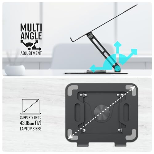 360° Rotatable Design: The laptop stand features a 360° rotatable design, offering unparalleled flexibility, allowing you to effortlessly adjust the orientation of your device, making it ideal for collaborative work environments.